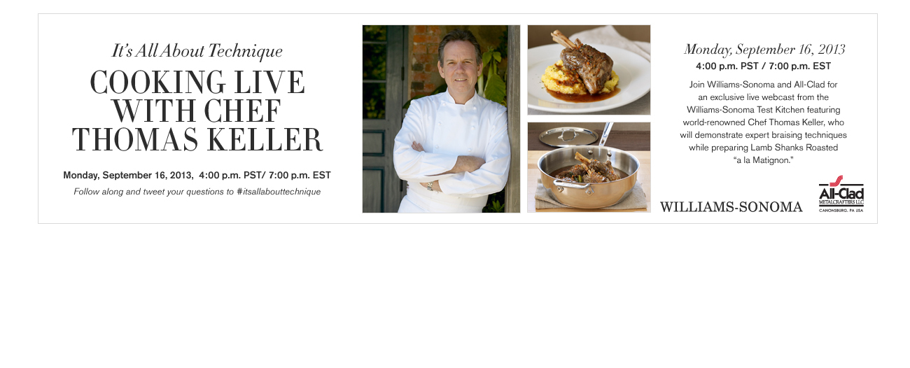 | | | Chef Keller will demonstrate expert braising techniques easy for the home cook to execute using Williams-Sonoma exclusive All-Clad copper core cookware. The webcast will include a Q & A with questions tweeted in by viewers. |