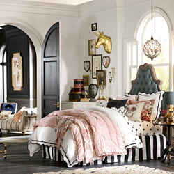 As the next chapter in the Emily & Meritt for PBteen story, the latest collection blends feminine and whimsical details with a touch of rock and roll. Drawing inspiration from trends in fashion, music and interiors, the collection reflects Emily & Meritt’s classic Americana design sensibility through vintage-inspired, yet modern, home furnishings and accessories. Gold is infused throughout the collection, adding shimmer and shine to bedding and accessories. Playful elements like cats, bunnies and unicorns create a sense of magic while the juxtaposition of sparkly and tough details lends just the right amount of edginess. The collection includes nearly 40 products across key categories such as furniture, bedding, lighting, wall décor, decorative accessories and jewelry storage.