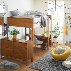 The West Elm x Pottery Barn Teen Collection leverages the aesthetic of West Elm’s beloved Mid-Century Collection as the foundation, and incorporates Pottery Barn Teen’s design innovation with tech-friendly and space-saving features. The West Elm x Pottery Barn Teen Mid-Century Loft Bed’s stacked configuration allows for extra study and work space underneath the loft, featuring a built-in-desk at the base and USB panels for easy charging. West Elm’s FSC®-certified Mid-Century Dresser fits securely underneath the bed to create the ultimate storage solution. The Mid-Century Storage Platform Bed includes side drawers and cubbies, and the Modern Captain’s Bed features a refined multi-finish white and pecan wood base with a mix of both concealed and open storage. To round out the collection, the Mid-Century Wall Desk features a simple silhouette and minimal hardware, enhanced with LED lighting, a USB power strip and a corkboard.