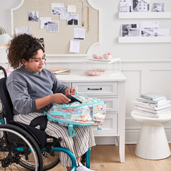 For Pottery Barn Teen, the Gear-Up Adaptive Backpack and Lunchbox Collection is full of style and designed to easily mount on a wheelchair. The backpack features an insulated pocket, a padded interior pocket, and a pouch for personal items as well as access ports that accommodate tubes and cables, and a hideaway pocket to stow backpack straps. The matching lunchbox features a carrying handle and roomy interior to store food. The Hampton Accessible Desk features a seat opening sized for a wheelchair, easy to grab drawer handles, and a beautiful finish to create a serene study space.
