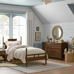 “This collection was designed with rich woods, nostalgic silhouettes, fresh patterns, and lots of character — with our daughters in mind! We wanted to design pieces that could grow with our kids: heirloom-quality furniture that would look just as sweet in a baby’s room as it would in a kid’s or teen’s room,” said Julia Marcum of Chris Loves Julia.