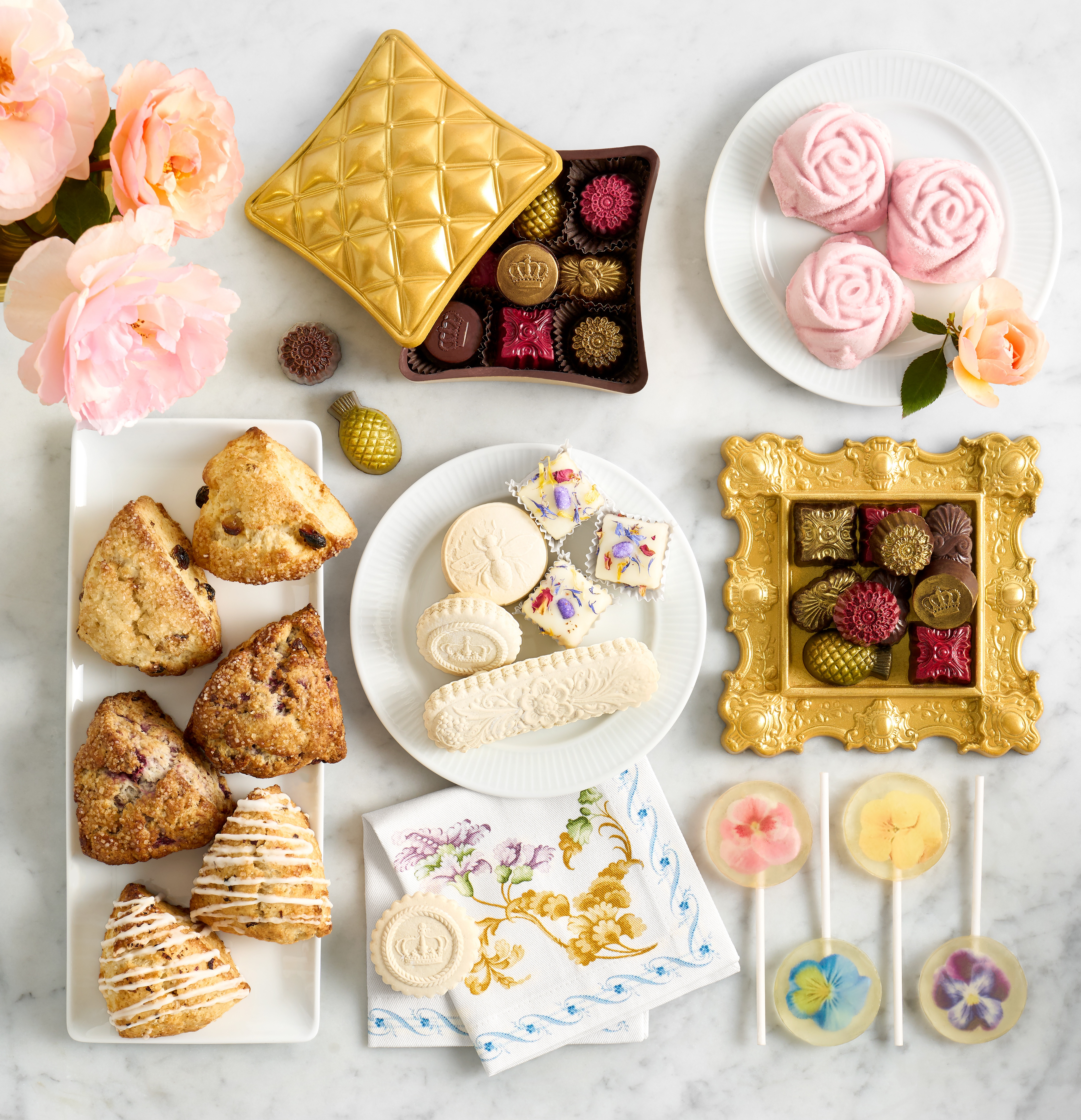 Mini Cakes, Scones, Teapot Cake Pops, Cameo Cookies, Springerlie Cookies and Ollalieberry Floral Petite Fours. $29.95 - $59.95.