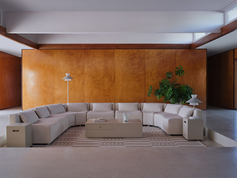 Key items from the collaboration include the Ceramic Shell Bowls, Bennett Lights, Checkered Rug, Lacquered Coffee Table, and the Modular Curved Sofa.