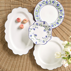 Garden Bouquet Dinnerware, Glazed stoneware featuring hand-painted blooms, flowering vines and scalloped silhouettes, the collection includes a charger, platter, dinner, and salad plates. Starting at $59.95.