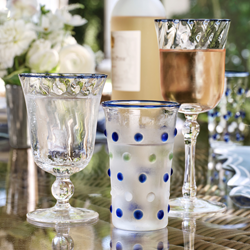 Confetti Tumblers, Crafted of mouth-blown glass and finished with hand-painted confetti dots and a blue rim. $79.95 (set of four).