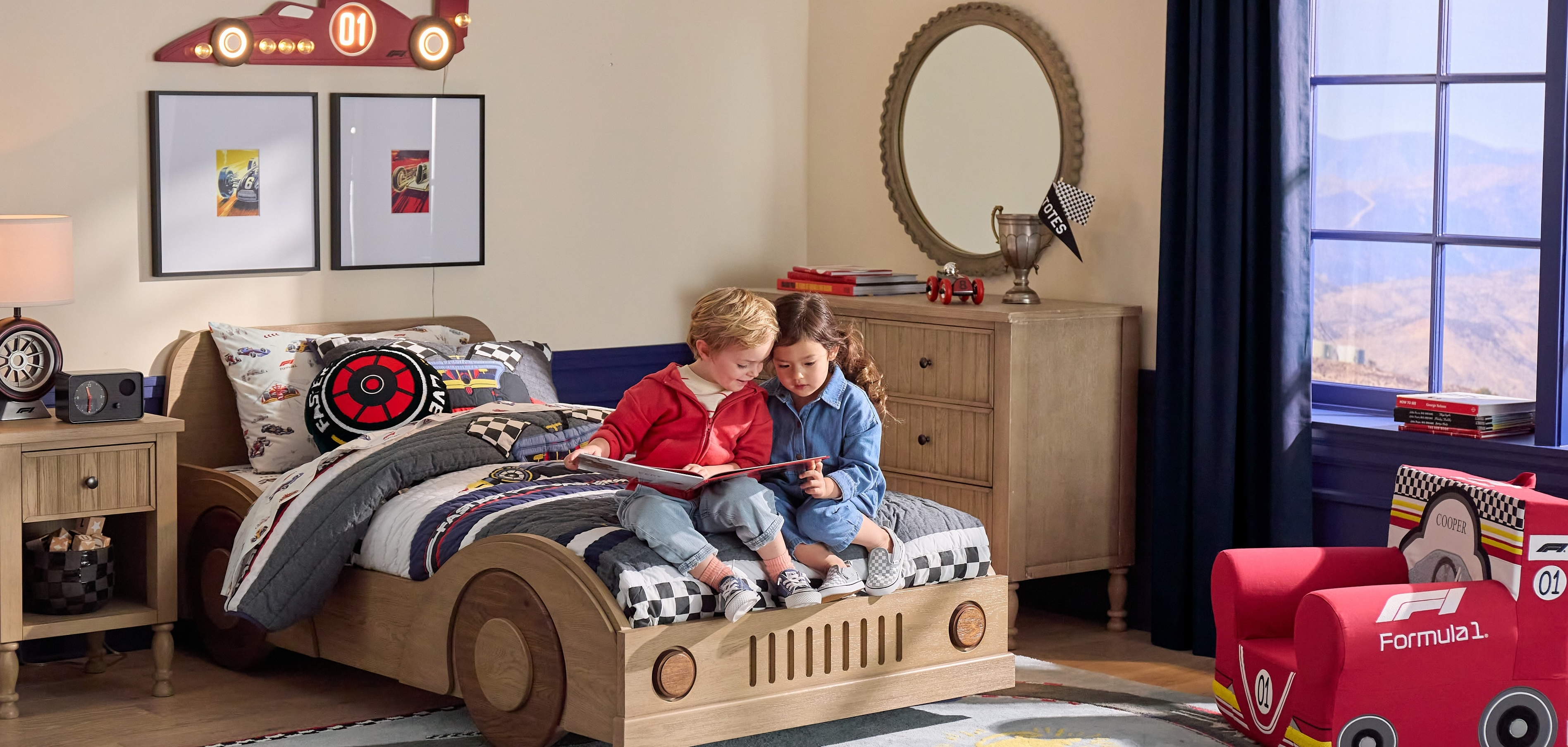 The Formula 1® for Pottery Barn Kids and Formula 1® for Pottery Barn Teen collections capture the bold spirit of racing through a striking palette of racing red, jet black, crisp white, and sleek metallic accents. Iconic checkered patterns and car-inspired motifs channel the adrenaline of the track into everyday spaces. The collection features textured embroidery and detailed graphic prints crafted with quality.