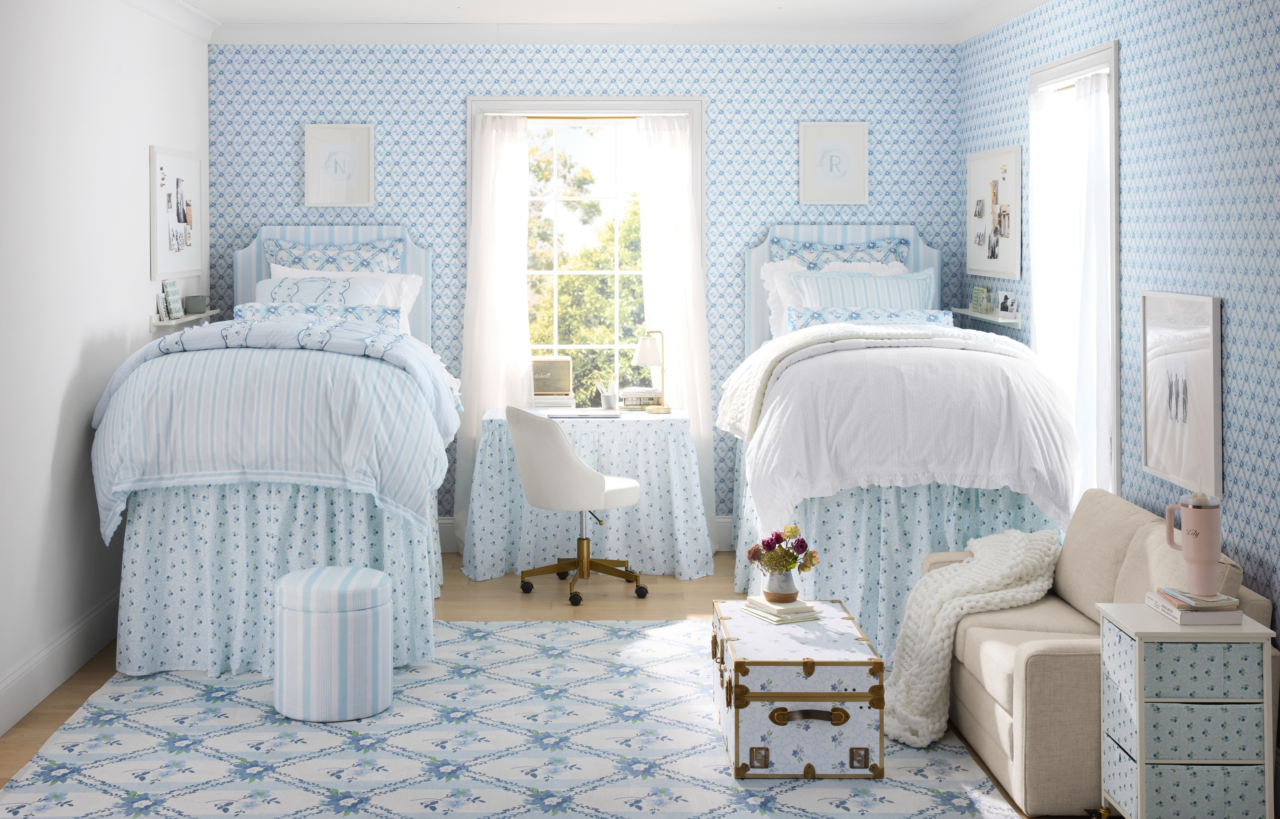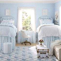 - Decorative Accessories: Scalloped table lamps, floral pinboards, detailed mirrors, patterned wallpaper, and desk mats that showcase Hill House Home’s signature prints.